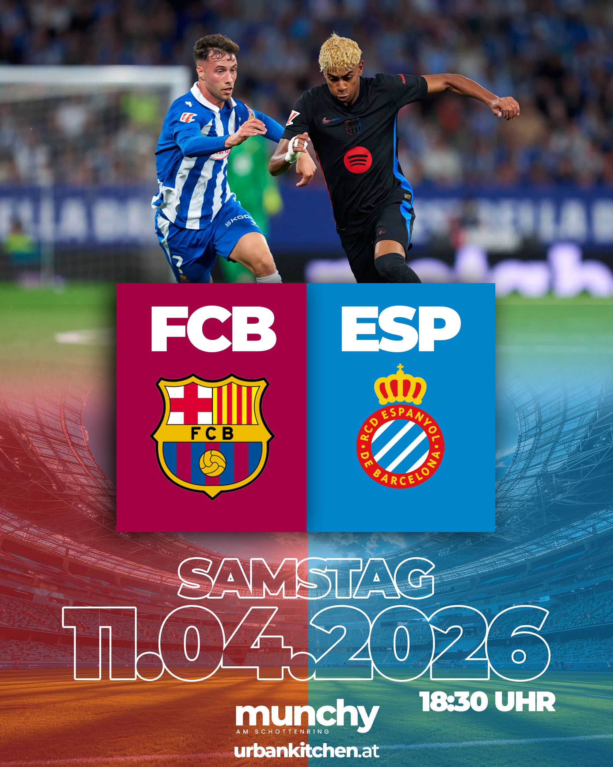 Erlebe das große Barcelona-Derby live bei Munchy am Schottenring und tauche ein in ein intensives LaLiga-Duell zwischen dem FC Barcelona und Espanyol, bei dem Emotion, Tempo und Rivalität auf höchstem Niveau aufeinandertreffen. Am Samstag, den 11.04.2026 um 18:30 Uhr, verwandelt sich Munchy in den ultimativen Hotspot für alle Fußballfans in Wien, die das Spiel nicht nur sehen, sondern fühlen wollen.