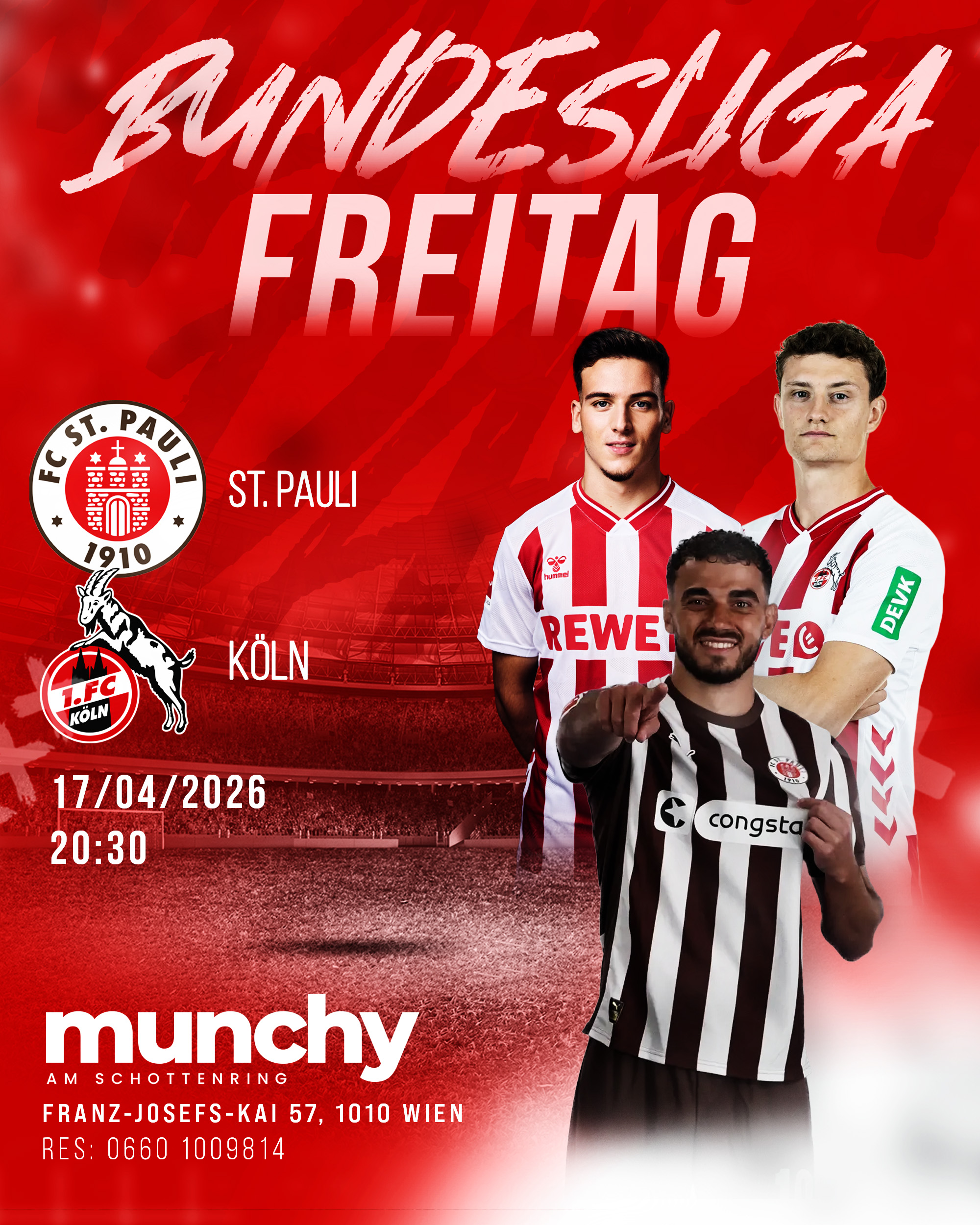 Erlebe Bundesliga Freitag live in Wien bei Munchy am Schottenring, wenn am 17.04.2026 um 20:30 Uhr der FC St. Pauli auf den 1. FC Köln trifft und ein intensives Duell mit viel Tempo, Zweikämpfen und Emotionen garantiert ist. Dieses Spiel bringt zwei traditionsreiche Vereine auf den Platz, die für leidenschaftlichen Fußball und eine starke Fanbasis stehen, was für eine besondere Atmosphäre sorgt.