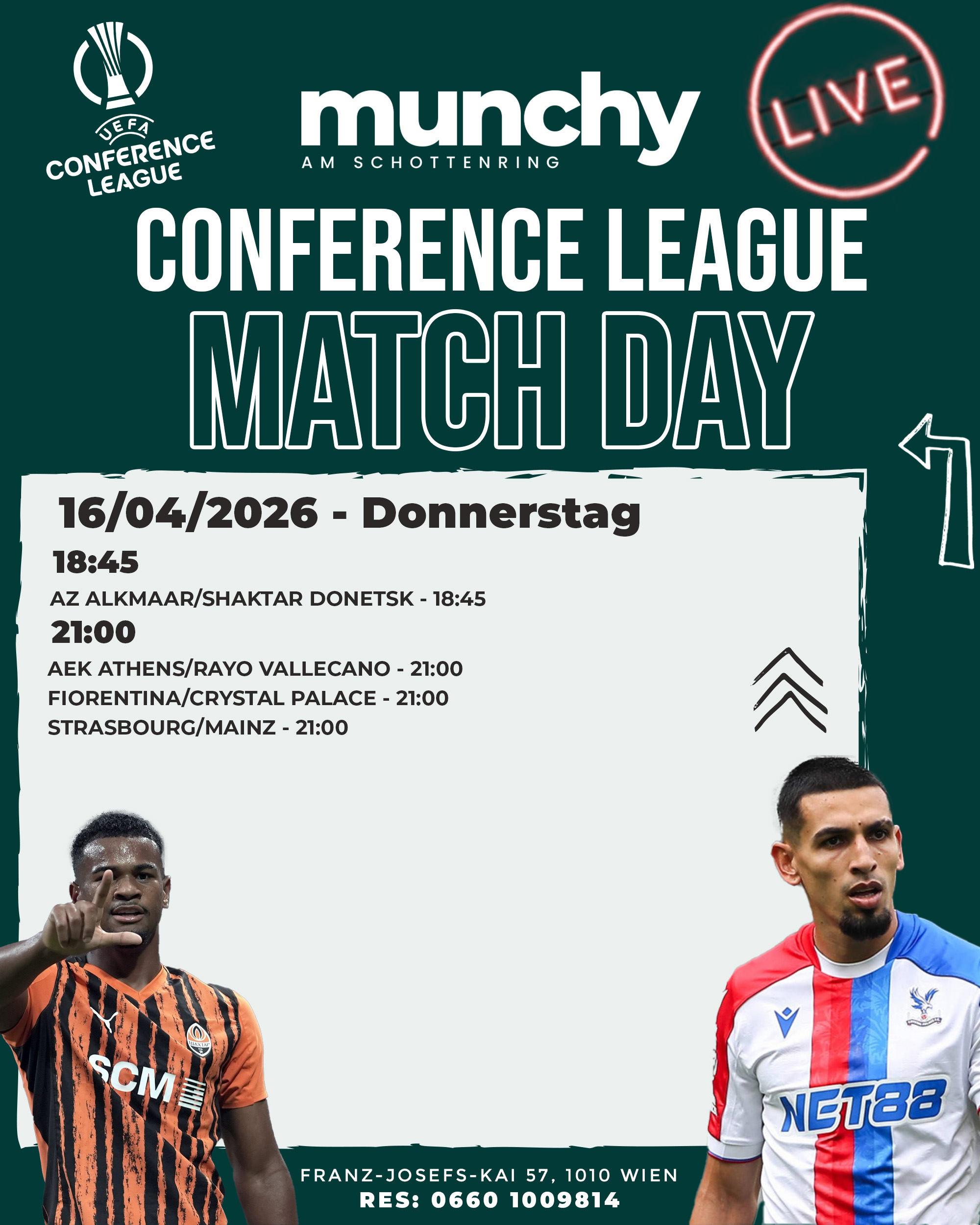 Erlebe einen intensiven UEFA Conference League Abend live bei Munchy am Schottenring in Wien, wenn am Donnerstag, den 16.04.2026 mehrere spannende Duelle parallel für echte Fußballatmosphäre sorgen. Bereits um 18:45 Uhr trifft AZ Alkmaar auf Shakhtar Donetsk, bevor um 21:00 Uhr gleich mehrere hochklassige Begegnungen folgen, darunter AEK Athens gegen Rayo Vallecano, Fiorentina gegen Crystal Palace sowie Strasbourg gegen Mainz.