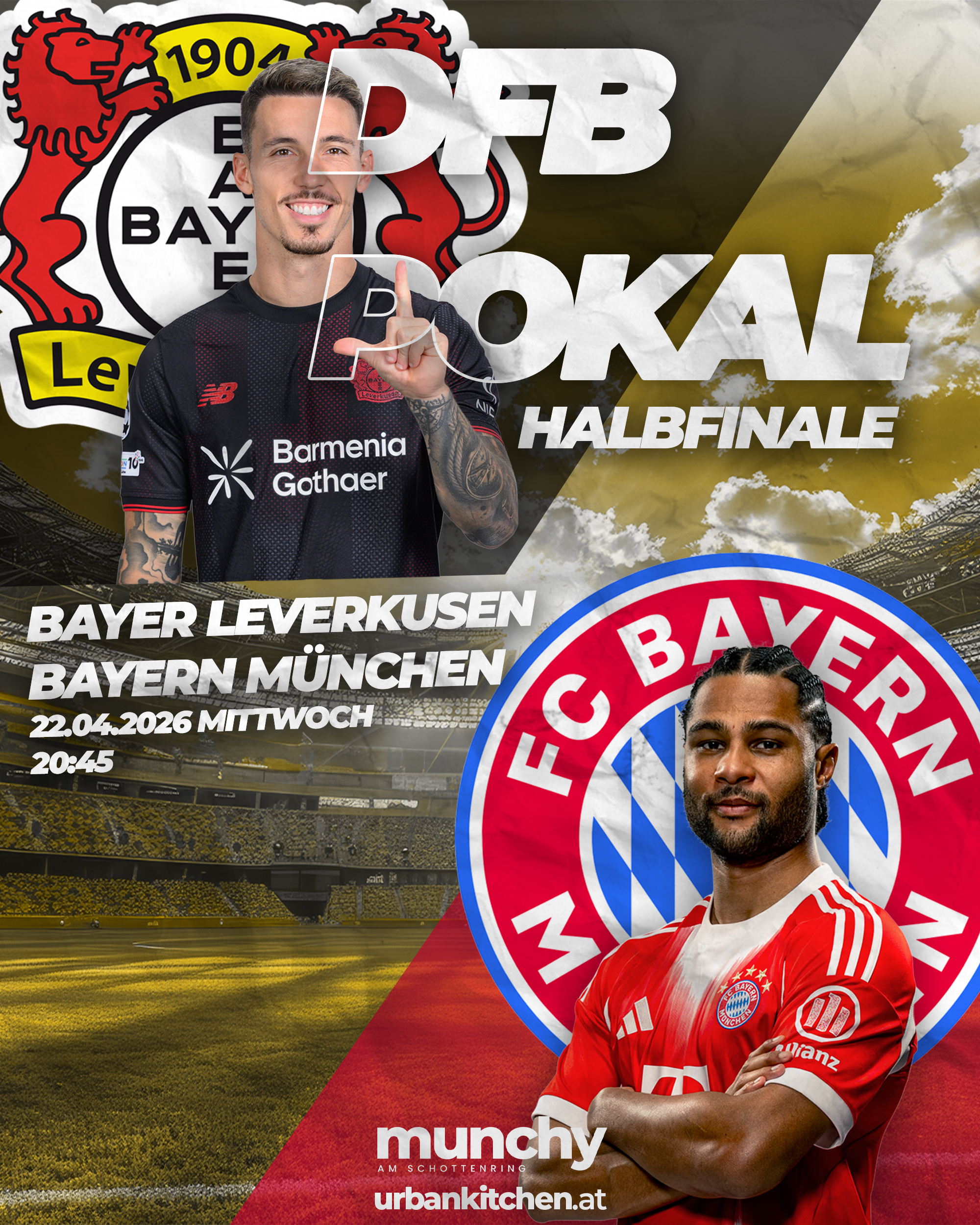 Erlebe das DFB-Pokal Halbfinale in einer Atmosphäre, die näher an ein Stadion als an eine Bar kommt. Wenn Bayer Leverkusen auf Bayern München trifft, wird Munchy am Schottenring zum pulsierenden Treffpunkt für alle Fußballfans in Wien. Großbildschirme, satte Soundkulisse und eine Energie, die jede Szene intensiver macht – hier wird das Spiel nicht nur geschaut, sondern gelebt.