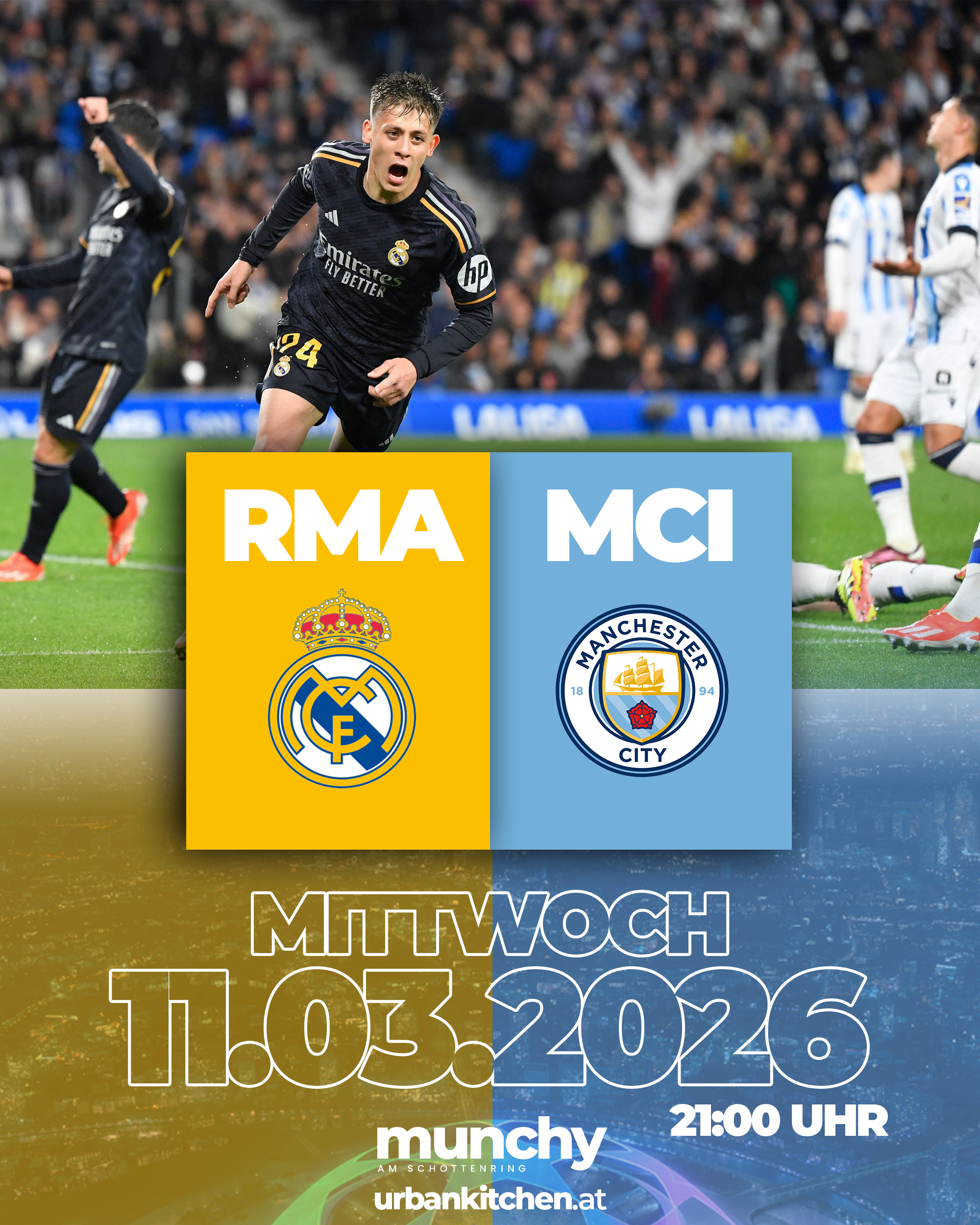 Am 11. März 2026 um 21:00 Uhr erwartet euch im Munchy am Schottenring eines der größten Duelle im europäischen Fußball: Real Madrid gegen Manchester City. Zwei absolute Topclubs treffen aufeinander – voller Weltklasse-Spieler, Tempo und spektakulärer Momente – und ihr könnt dieses Spiel live auf unseren Screens mitten in Wien erleben.