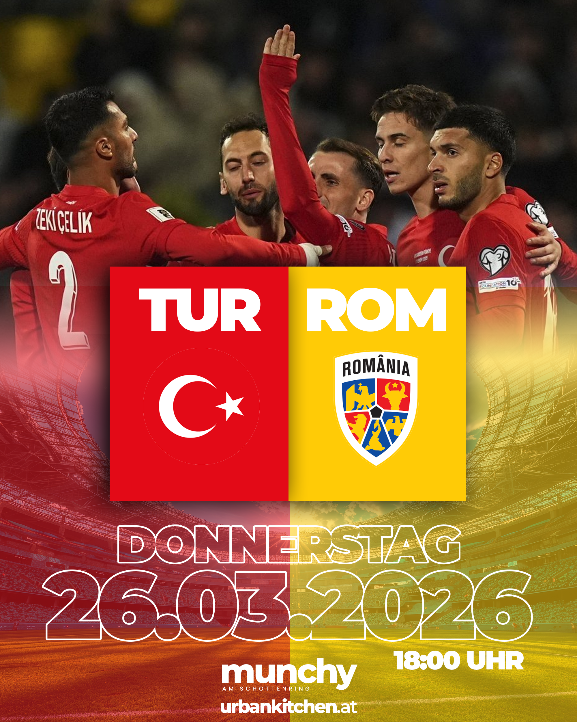 Donnerstag, 26.03.2026 um 18:00 Uhr. Komm vorbei, sichere dir früh deinen Platz und erlebe Türkei gegen Rumänien so, wie es sein sollte.