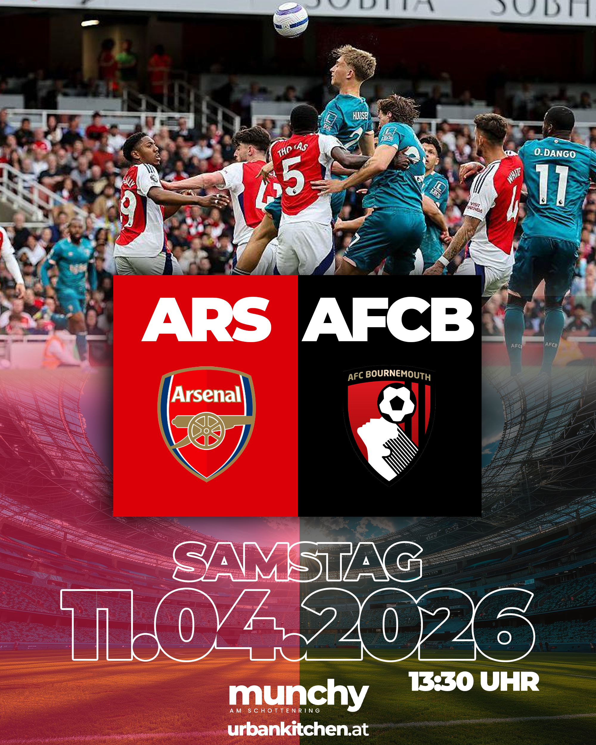 Erlebe Arsenal gegen Bournemouth live bei Munchy am Schottenring und genieße ein intensives Premier-League-Duell mit starker Atmosphäre und echtem Stadionfeeling mitten in Wien.