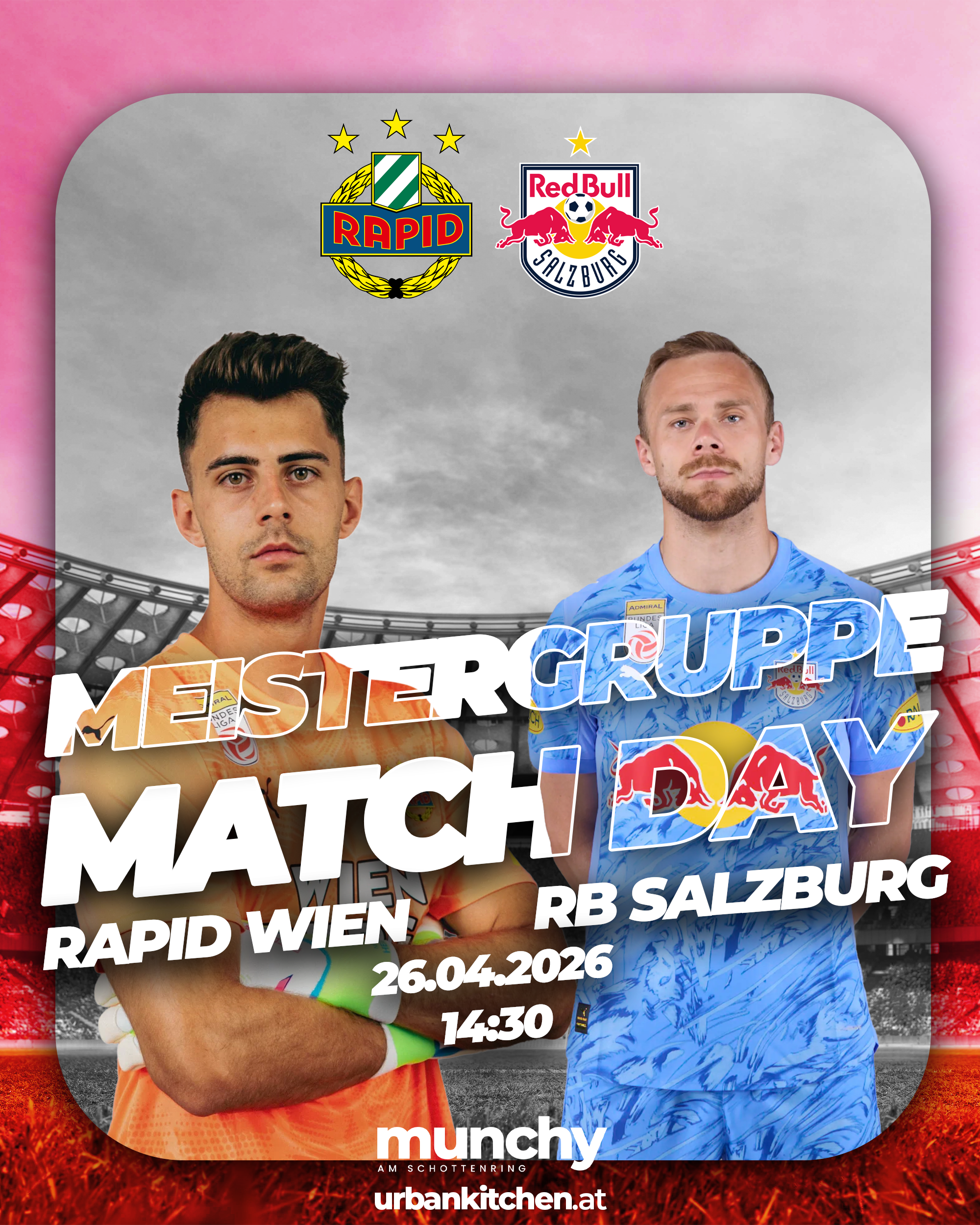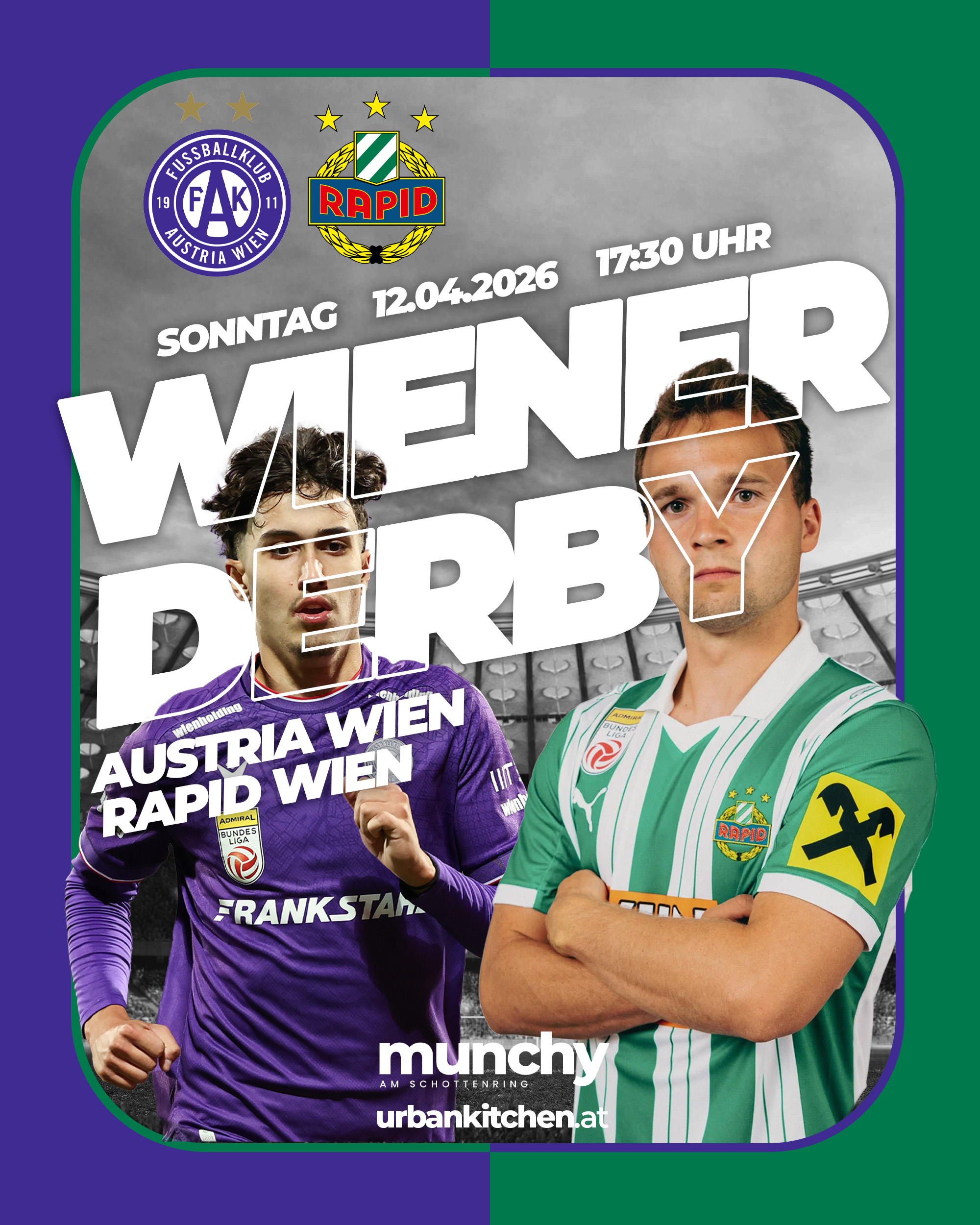 Erlebe das Wiener Derby Austria Wien vs. Rapid live bei Munchy am Schottenring mit intensiver Meistergruppe-Action, elektrisierender Atmosphäre und echtem Stadionfeeling. |