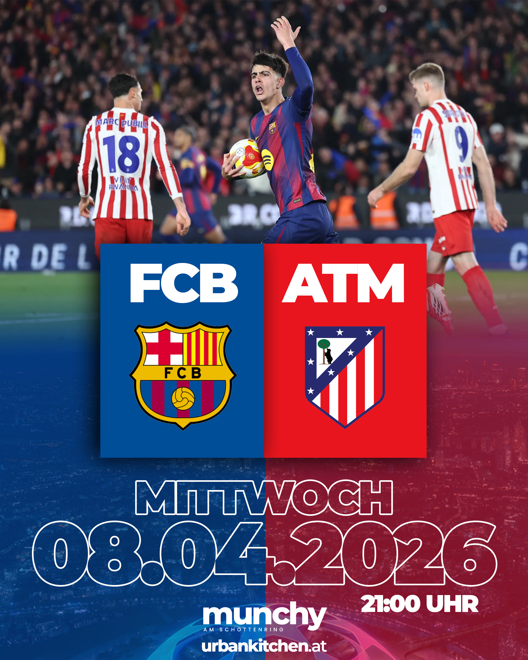 Erlebe Barcelona gegen Atlético Madrid live bei Munchy am Schottenring und genieße ein intensives Champions-League-Duell mit elektrisierender Atmosphäre und echtem Stadionfeeling mitten in Wien. |