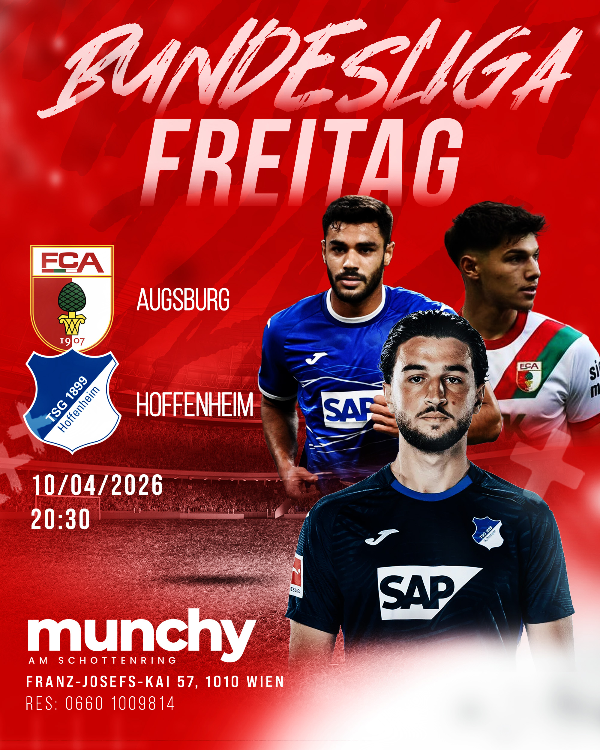 Erlebe Augsburg gegen Hoffenheim live bei Munchy am Schottenring und starte dein Wochenende mit einem intensiven Bundesliga-Duell und echtem Stadionfeeling mitten in Wien.