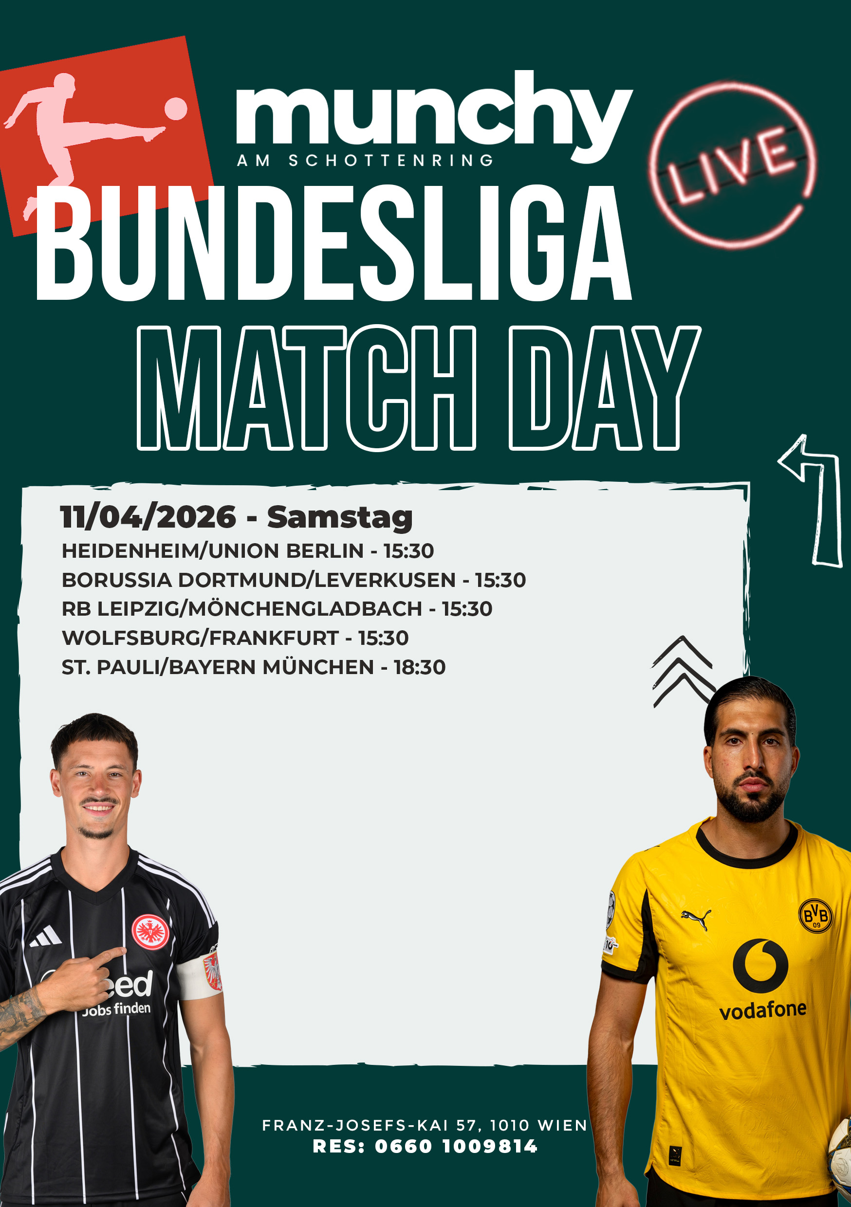 Bundesliga Match Day live bei Munchy am Schottenring – mehrere Topspiele, volle Stadionstimmung und ein ganzer Tag Fußball auf höchstem Niveau in einer Atmosphäre, die man spürt.