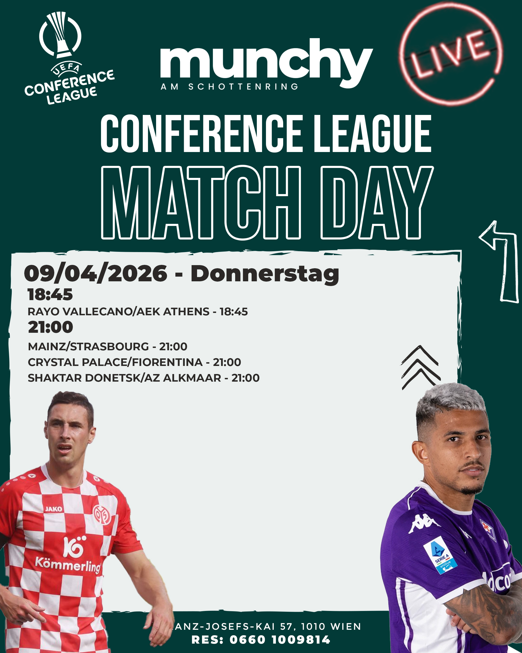 Erlebe die UEFA Conference League live in Wien bei Munchy am Schottenring mit AZ Alkmaar gegen Shakhtar Donetsk sowie AEK Athens gegen Rayo Vallecano, Fiorentina gegen Crystal Palace und Strasbourg gegen Mainz in echter Matchday-Atmosphäre. |