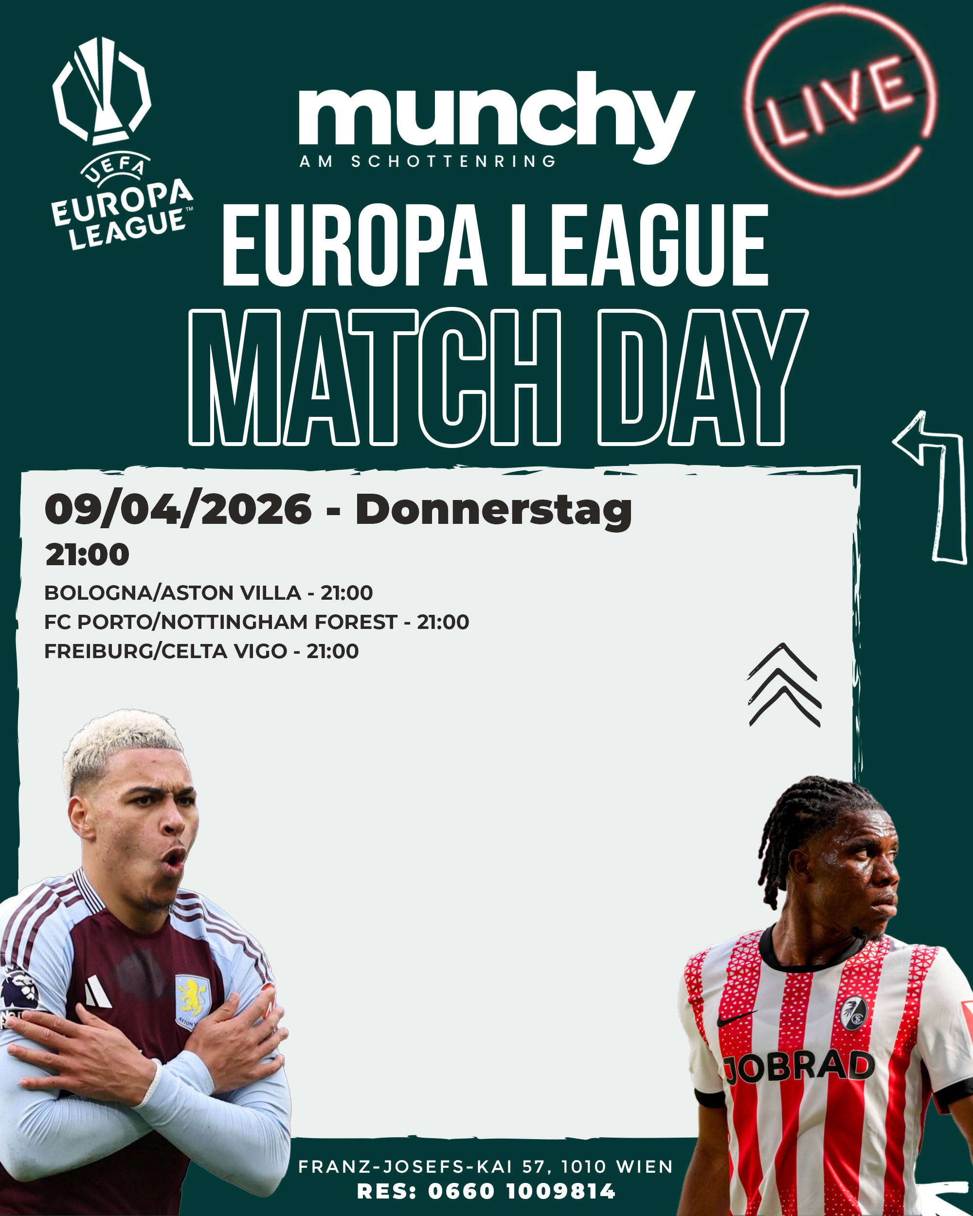 Erlebe einen intensiven Europa-League-Abend live bei Munchy am Schottenring in Wien, wenn Spiele wie Celta Vigo gegen Freiburg, Aston Villa gegen Bologna, Nottingham Forest gegen FC Porto und Real Betis gegen Braga gleichzeitig für Spannung, Tempo und echte Matchday-Atmosphäre sorgen.
