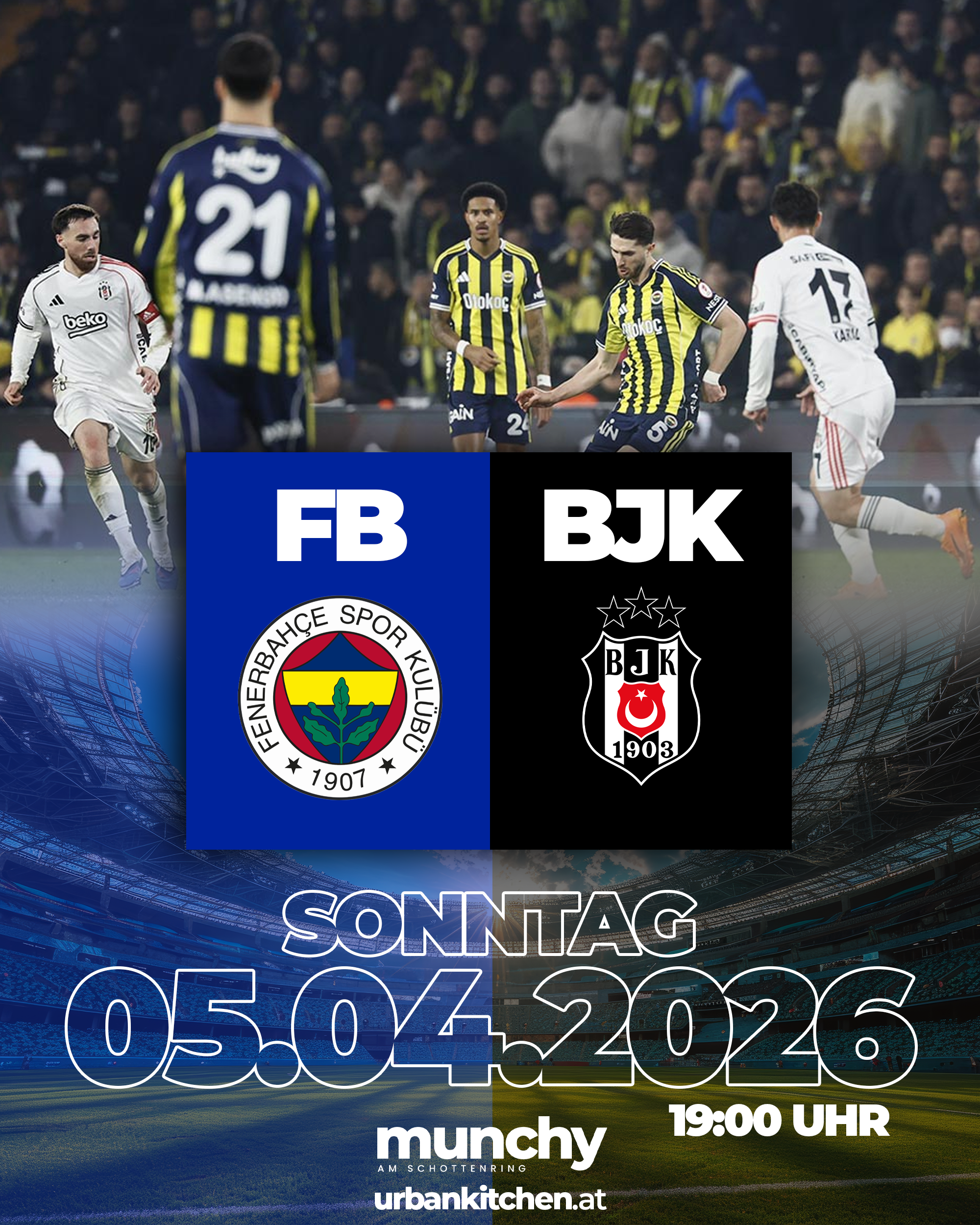 Erlebe Fenerbahçe gegen Beşiktaş live bei Munchy am Schottenring und genieße ein emotionales Derby mit elektrisierender Atmosphäre, starken Drinks und echtem Stadionfeeling mitten in Wien. |