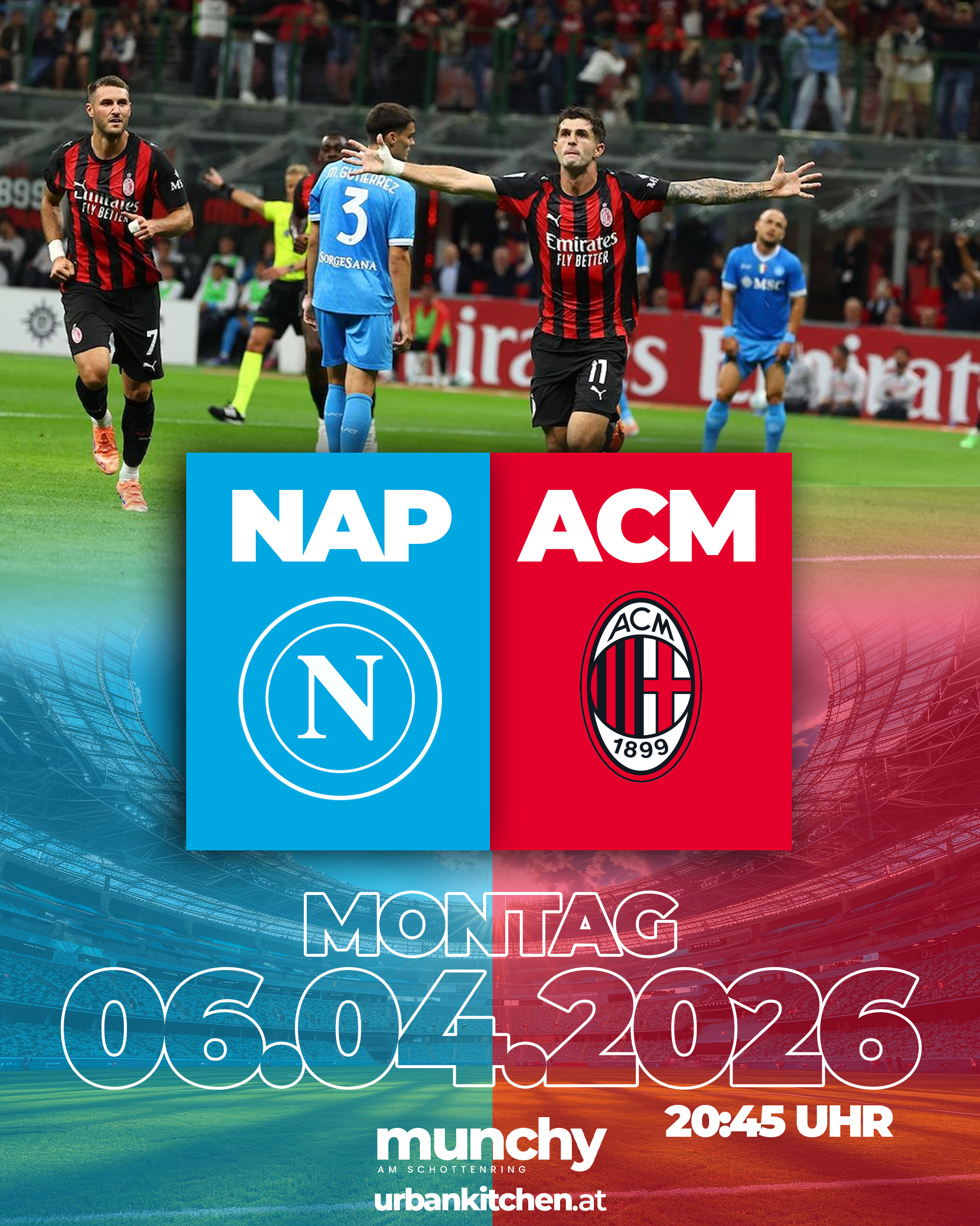 Erlebe Napoli gegen AC Milan live bei Munchy am Schottenring und genieße ein intensives Serie A Topspiel mit elektrisierender Atmosphäre und echtem Stadionfeeling mitten in Wien. |
