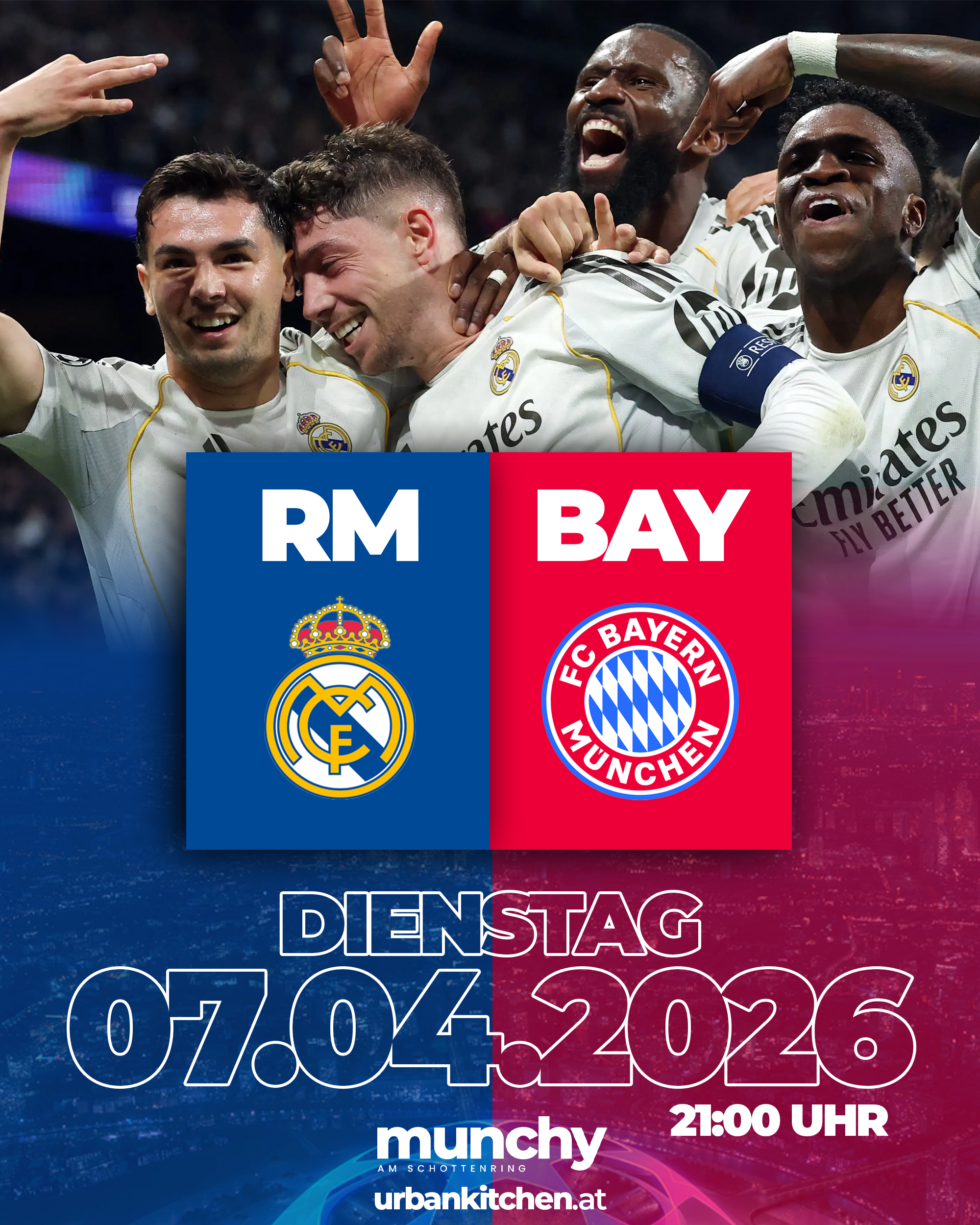 Erlebe das Champions-League-Topspiel Bayern München gegen Real Madrid live bei Munchy am Schottenring in Wien mit intensiver Atmosphäre, großen Screens und echtem Stadionfeeling. |