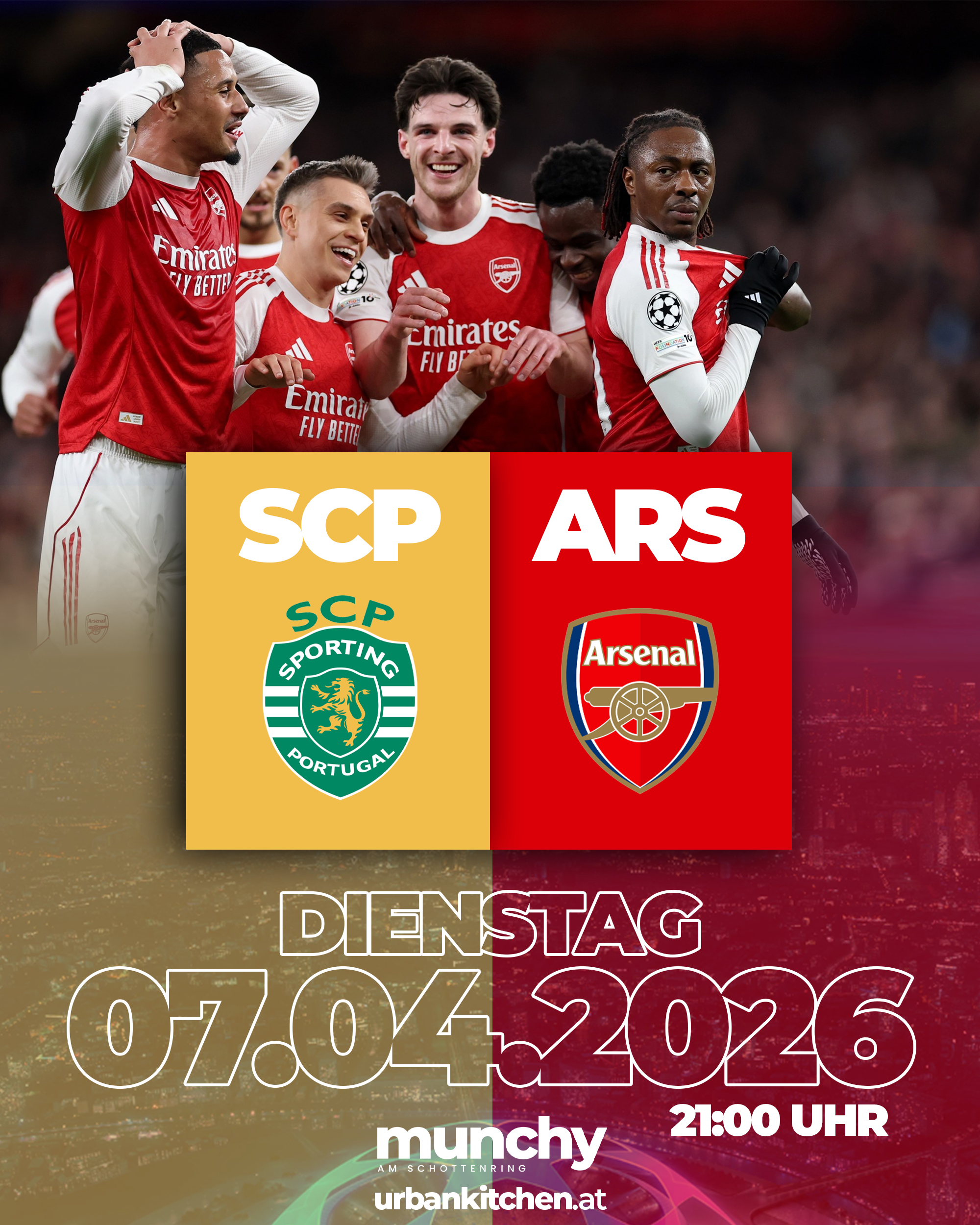 Erlebe Arsenal gegen Sporting CP live bei Munchy am Schottenring in Wien mit intensiver Champions-League-Atmosphäre, großen Screens und echtem Stadionfeeling.