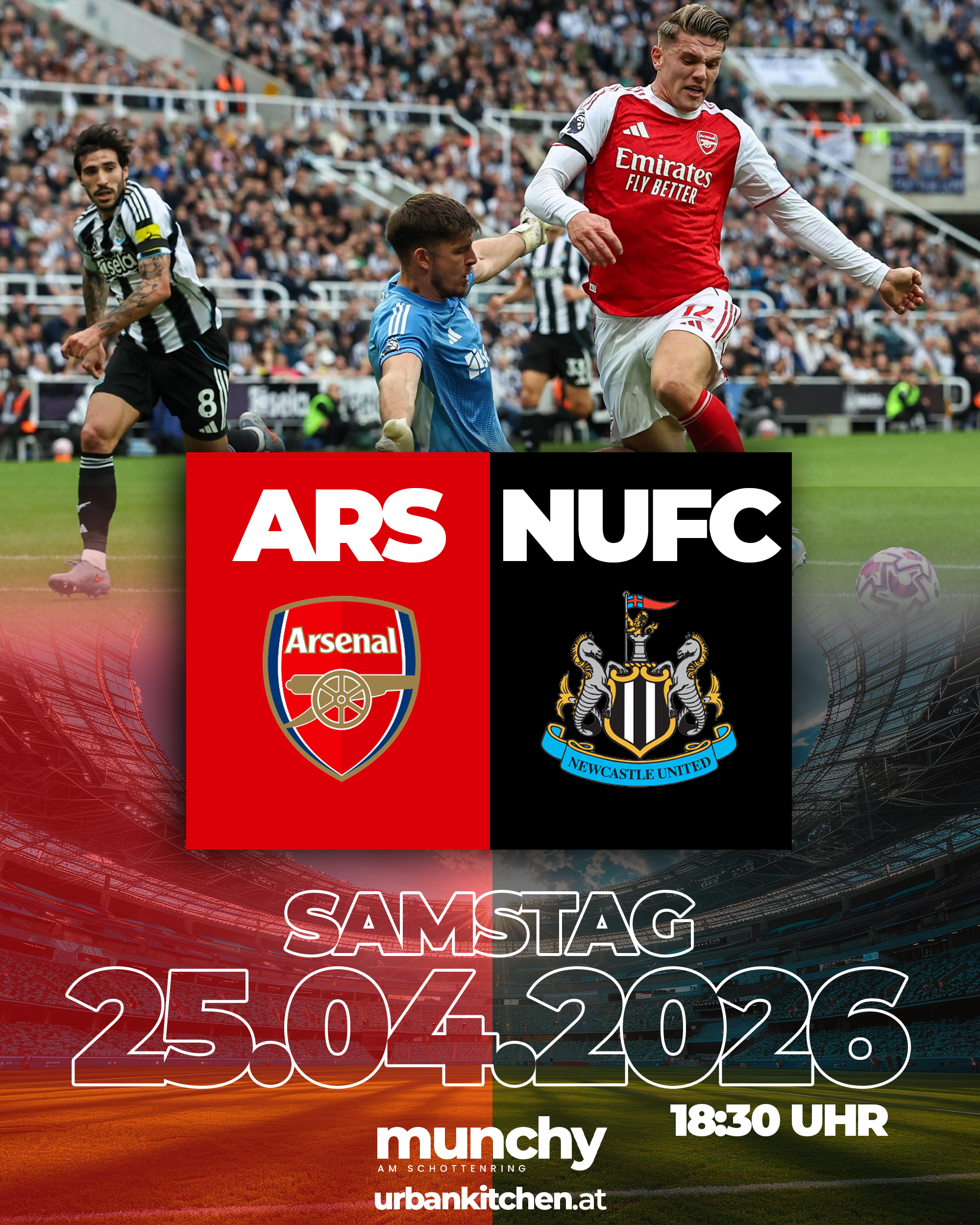 Erlebe das Premier League Duell zwischen Arsenal und Newcastle United im Munchy am Schottenring in intensiver Stadionatmosphäre mit großer Crowd und echtem Matchday-Feeling. |