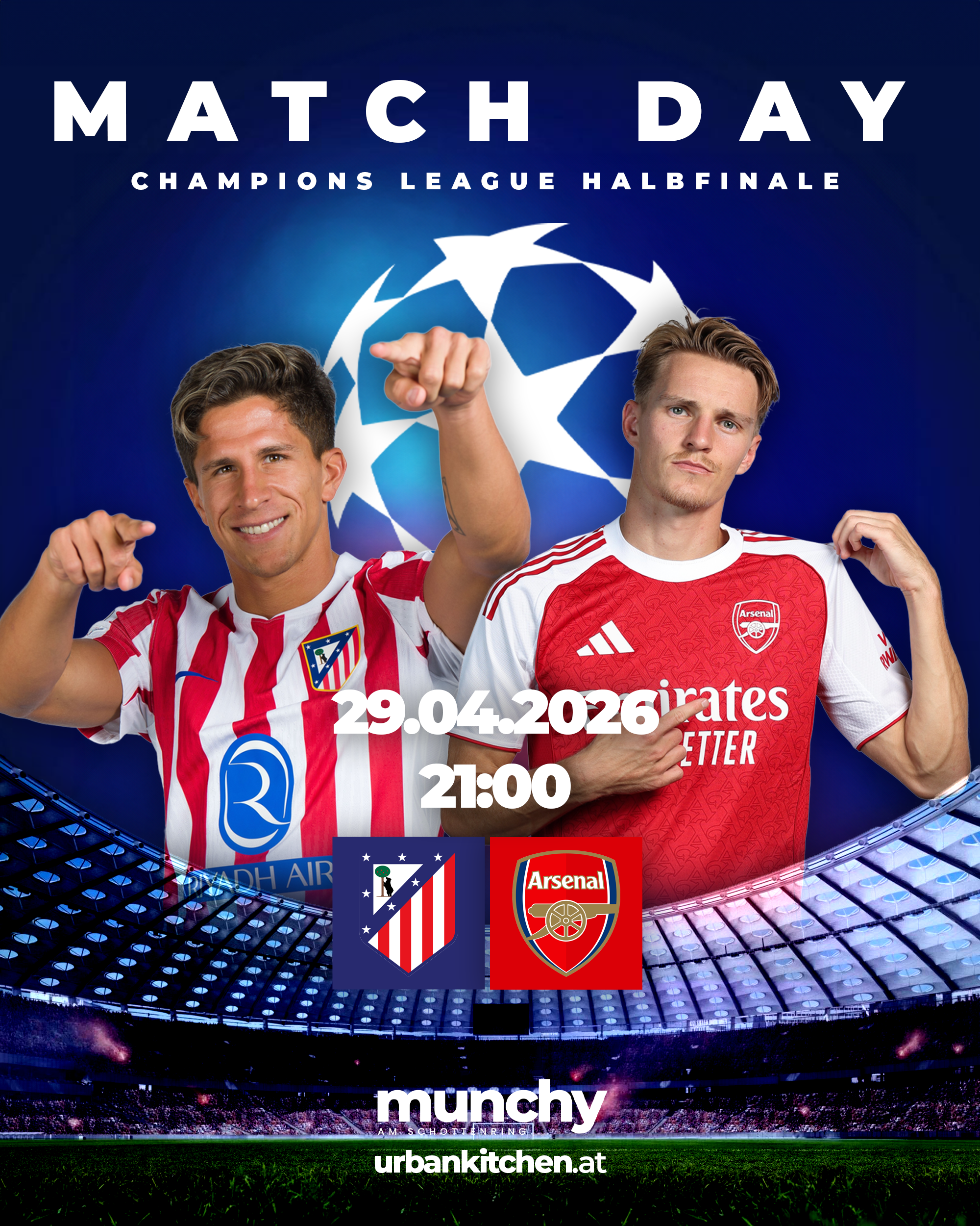 Erlebe das Champions League Halbfinale zwischen Atlético Madrid und Arsenal im Munchy am Schottenring mit intensiver Stadionatmosphäre, großer Crowd und echtem Matchday-Feeling. |
