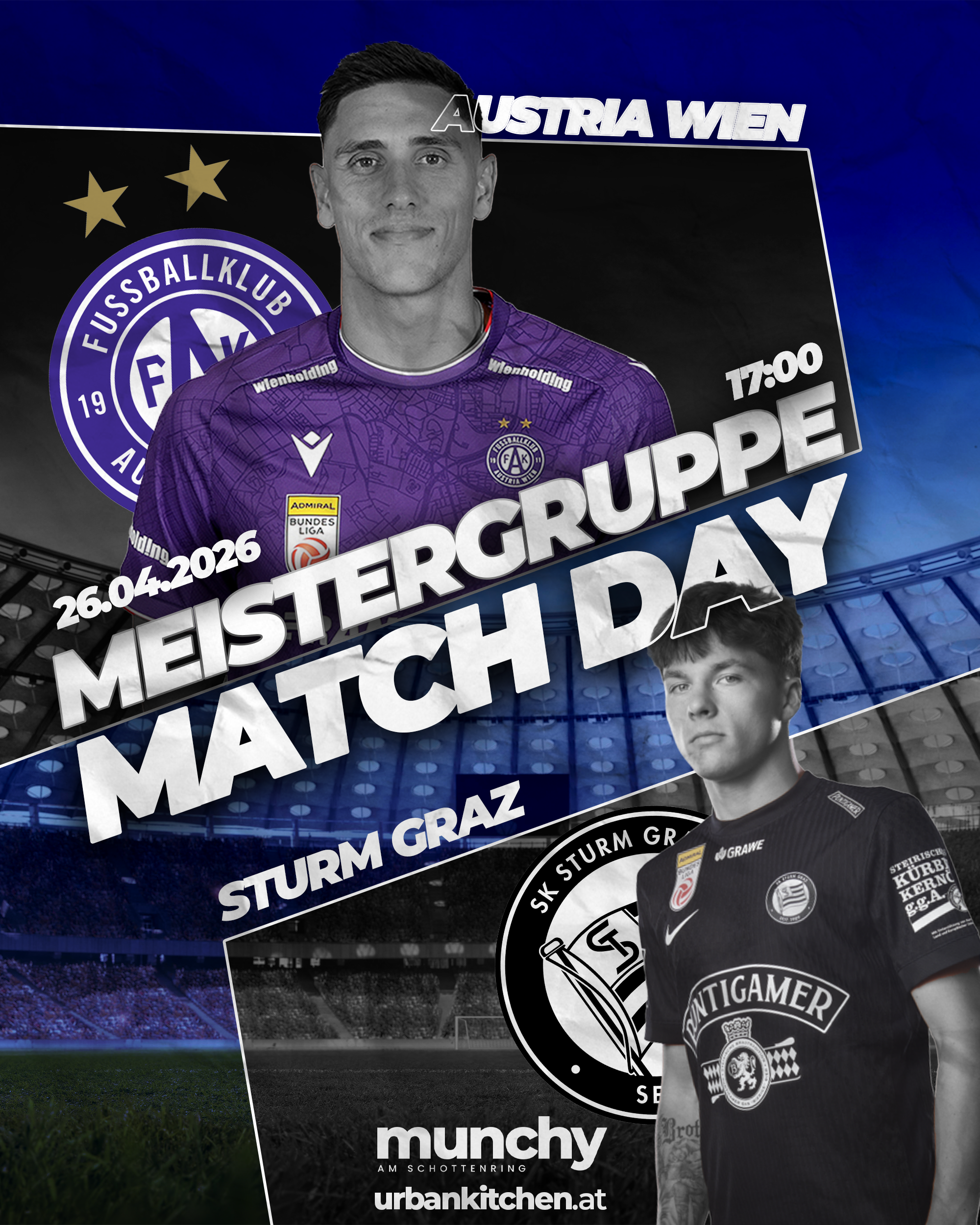 Meistergruppe Match Day live bei Munchy am Schottenring – Austria Wien gegen Salzburg und Hartberg gegen Rapid in einer intensiven Stadionatmosphäre, die jeden Moment spürbar macht.
