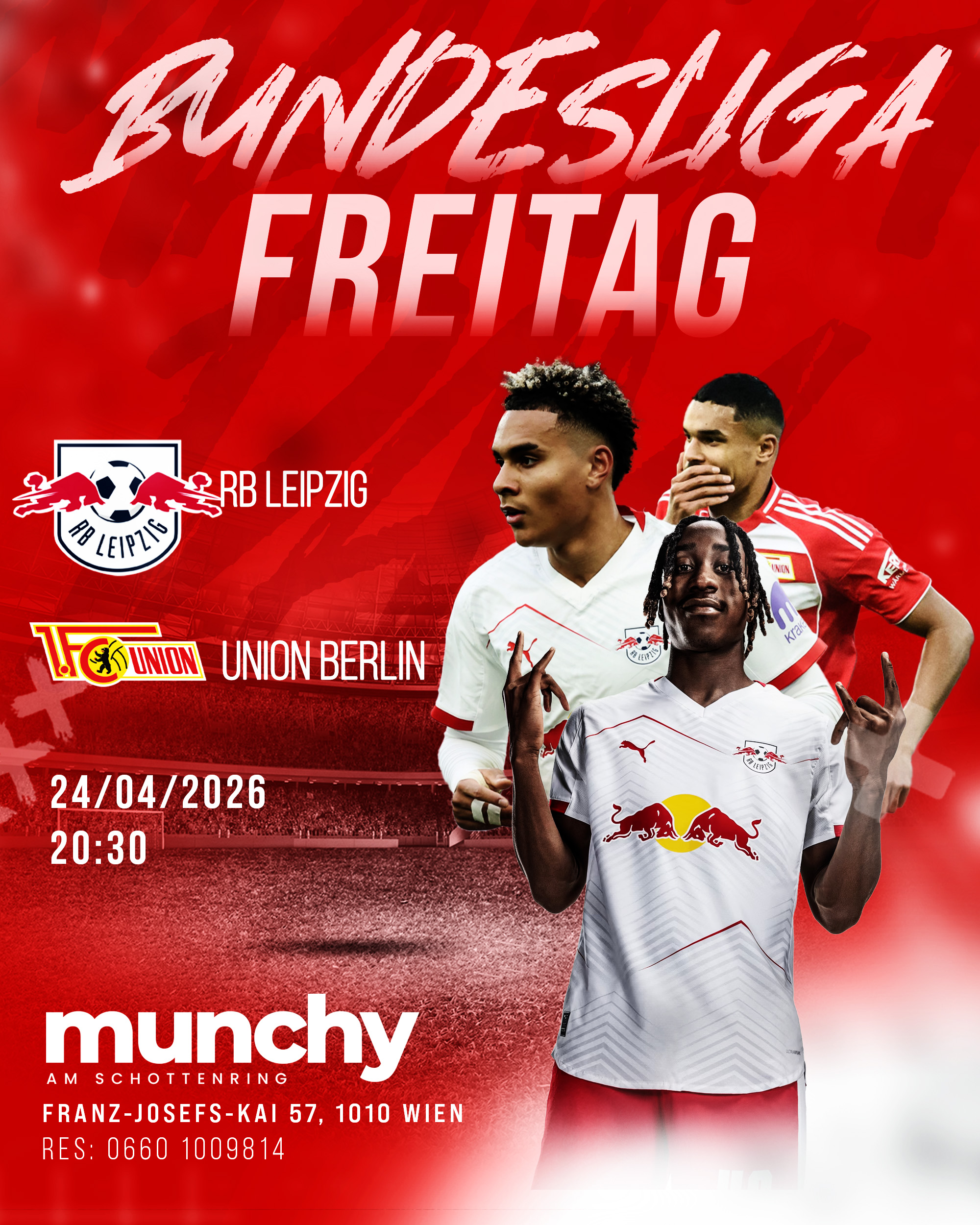 Erlebe RB Leipzig gegen Union Berlin in mitreißender Stadionatmosphäre mit großen Screens, starkem Sound und echter Matchday-Energie live im Munchy am Schottenring.