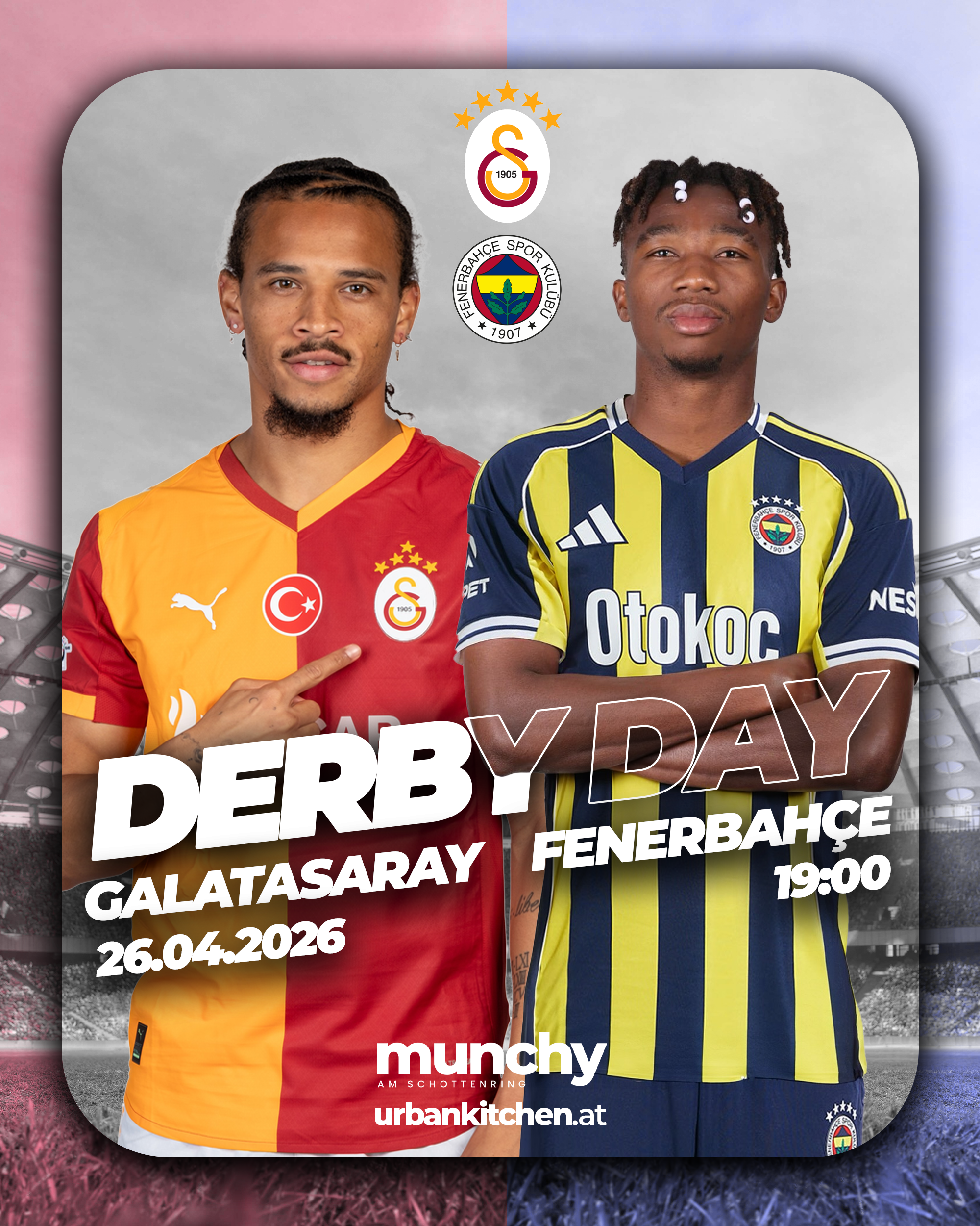 Erlebe das legendäre Derby zwischen Galatasaray und Fenerbahçe live im Munchy am Schottenring mit maximaler Intensität und elektrisierender Matchday-Atmosphäre. |