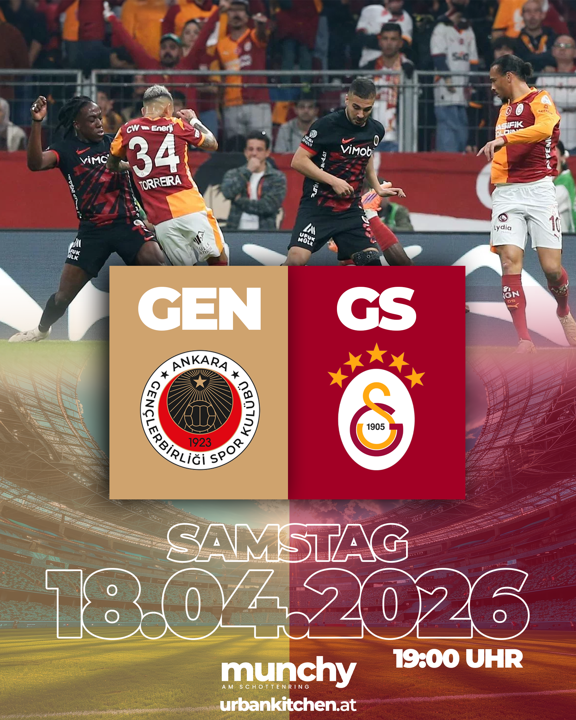 Erlebe das spannende Süper-Lig-Duell zwischen Gençlerbirliği und Galatasaray am 18.04.2026 um 19:00 Uhr live im Munchy am Schottenring in einzigartiger Fußballatmosphäre. |