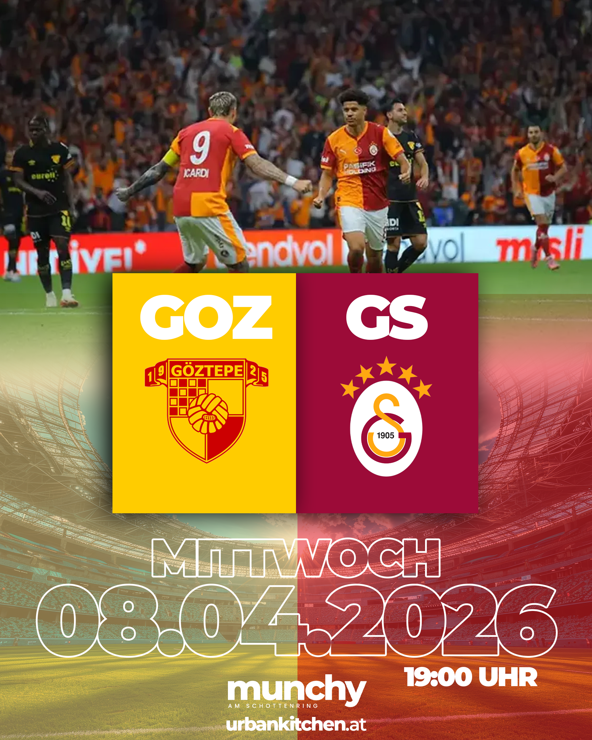 Erlebe das leidenschaftliche Duell zwischen Göztepe und Galatasaray live im Munchy am Schottenring mit intensiver Atmosphäre, starken Emotionen und echtem Matchday-Feeling.