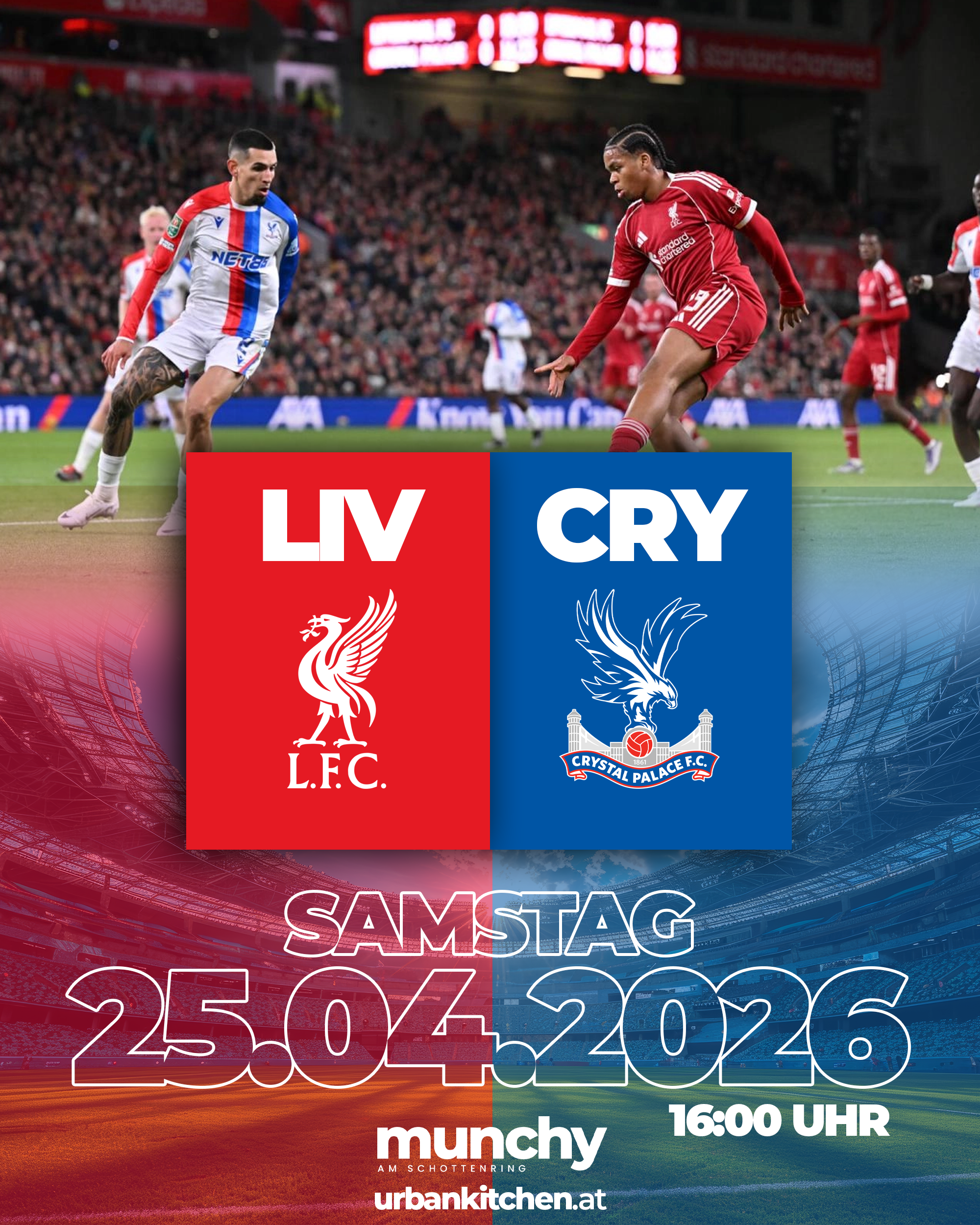 Erlebe Liverpool gegen Crystal Palace in intensiver Stadionatmosphäre mit großen Screens und echter Matchday-Energie live im Munchy am Schottenring.