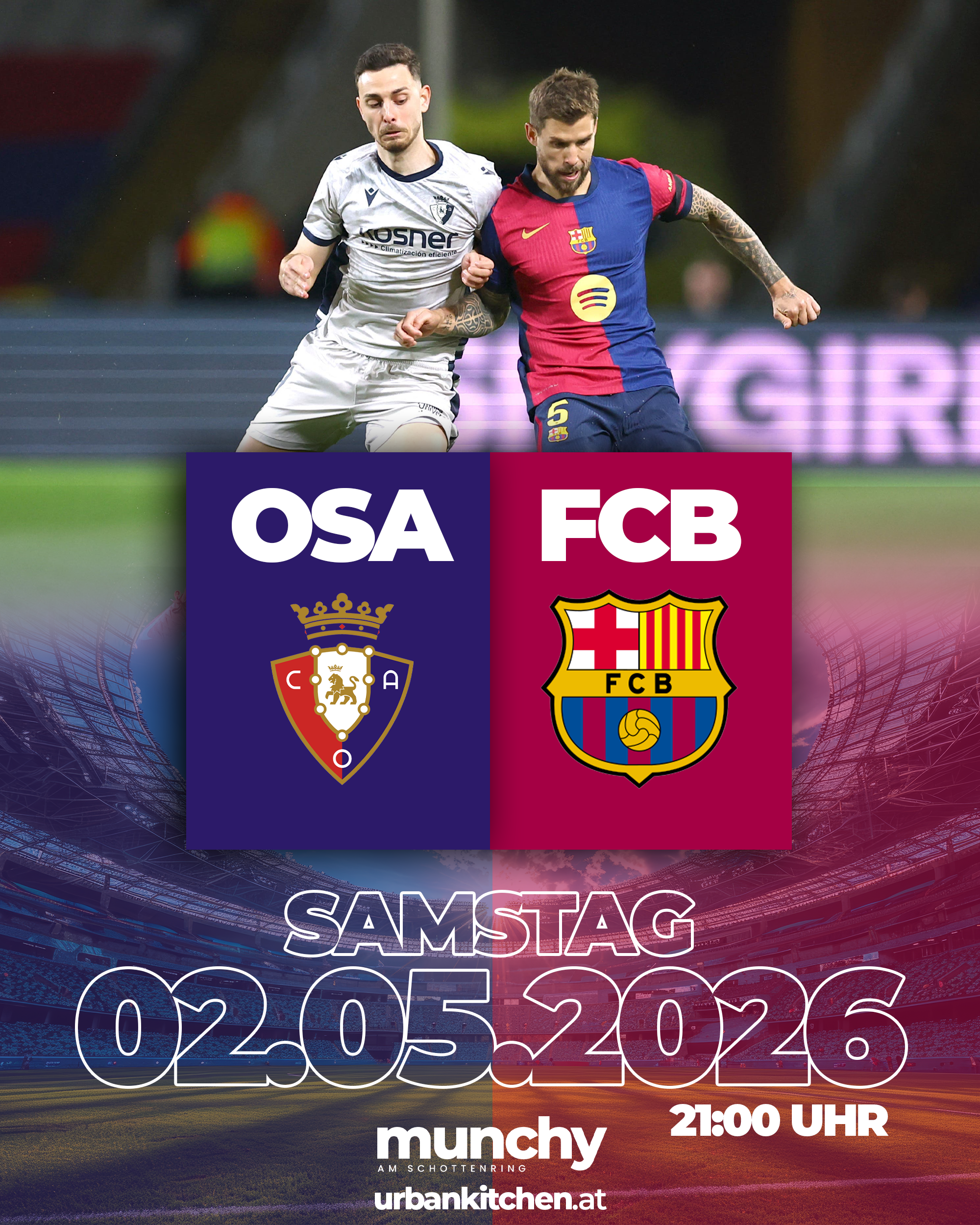 Osasuna gegen FC Barcelona im Munchy am Schottenring – Topspiel, maximale Spannung und echtes Stadiongefühl mitten in Wien. |