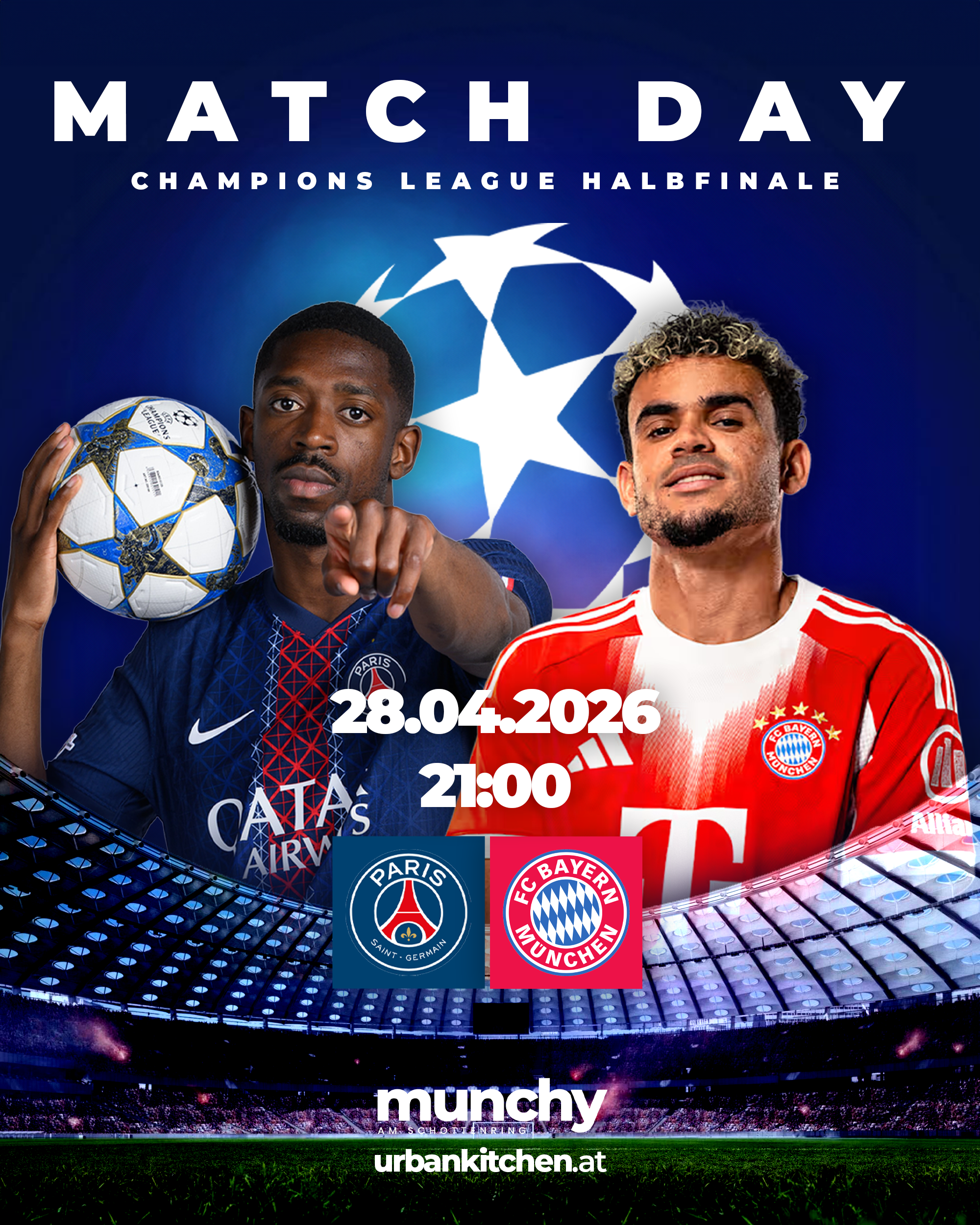 Erlebe das Champions League Halbfinale zwischen PSG und Bayern München im Munchy am Schottenring in intensiver Stadionatmosphäre mit großer Crowd, starken Drinks und echtem Matchday-Feeling. |