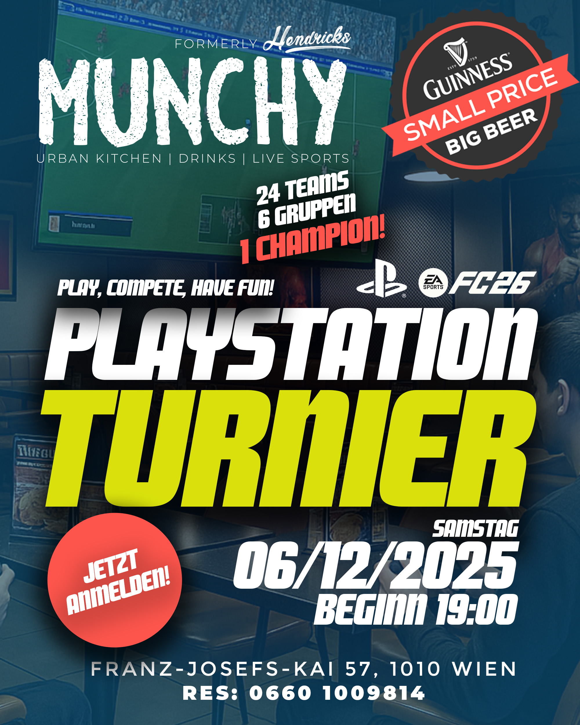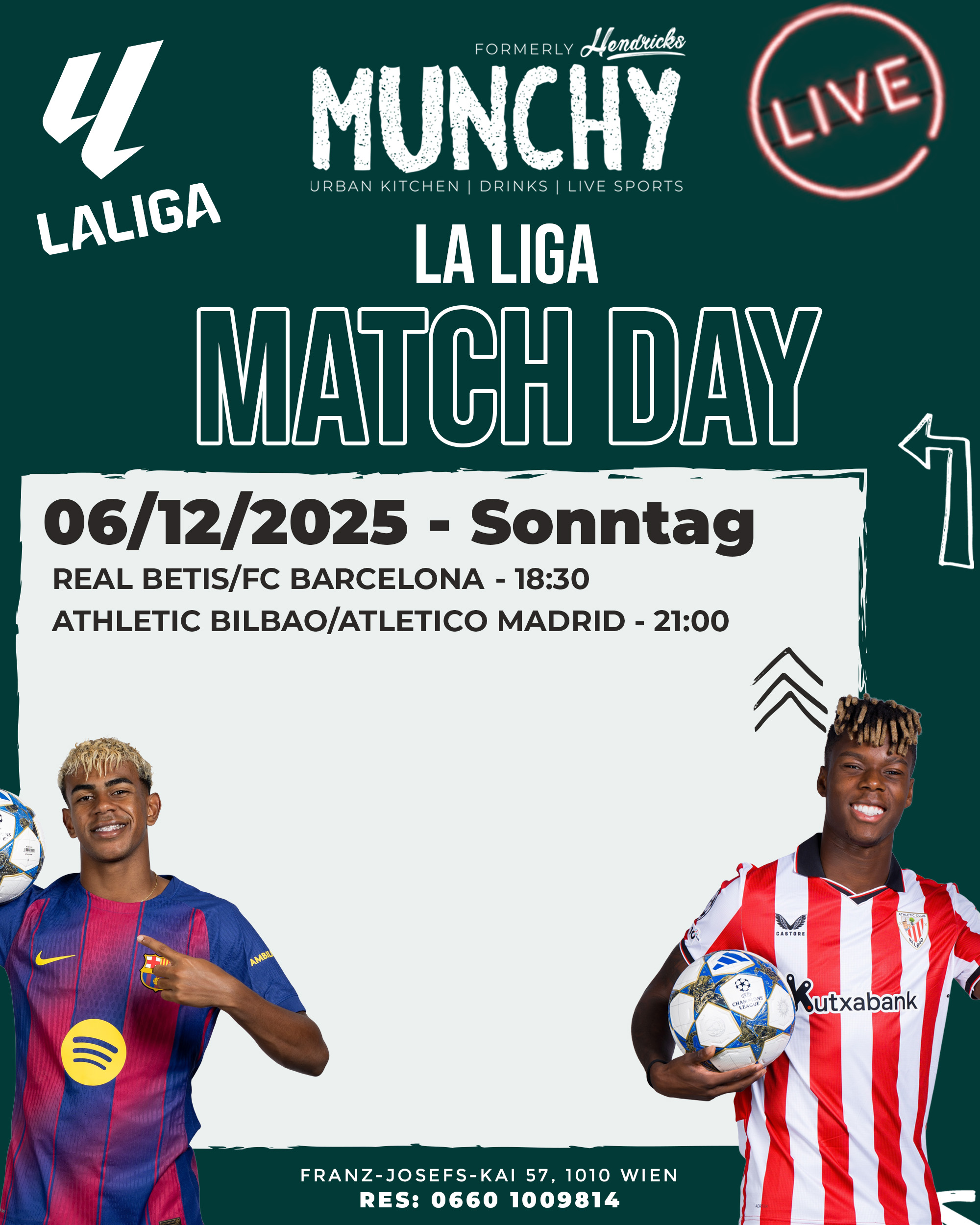 Munchy The Urban Kitchen Franz-Josefs-Kai 57, Wien, AustriaErlebe das LaLiga-Topspiel FC Barcelona gegen Atlético Madrid am 2. Dezember um 21:00 Uhr live bei Munchy The Urban Kitchen – volle Spannung, starke Stimmung und Fußball auf höchstem Niveau!