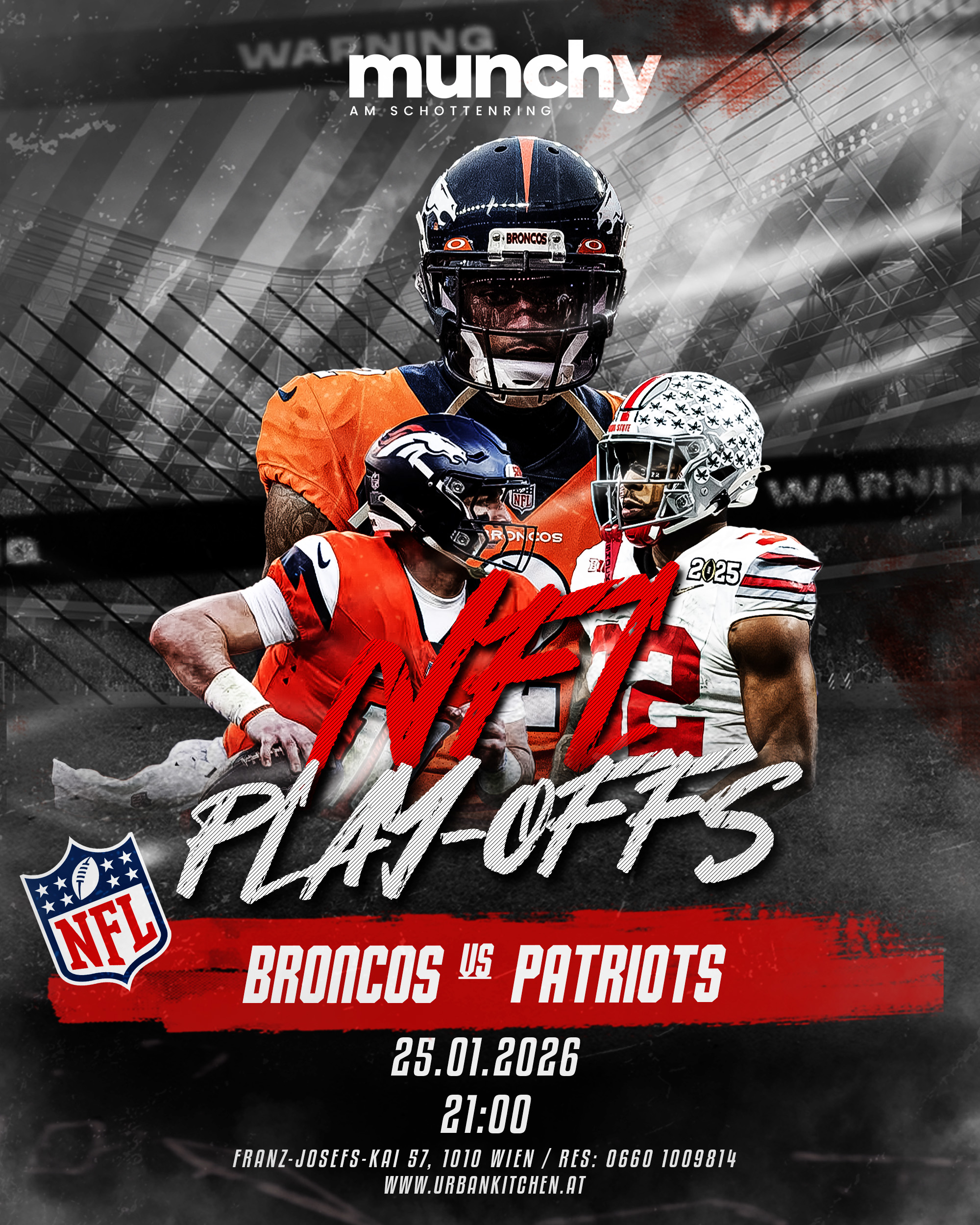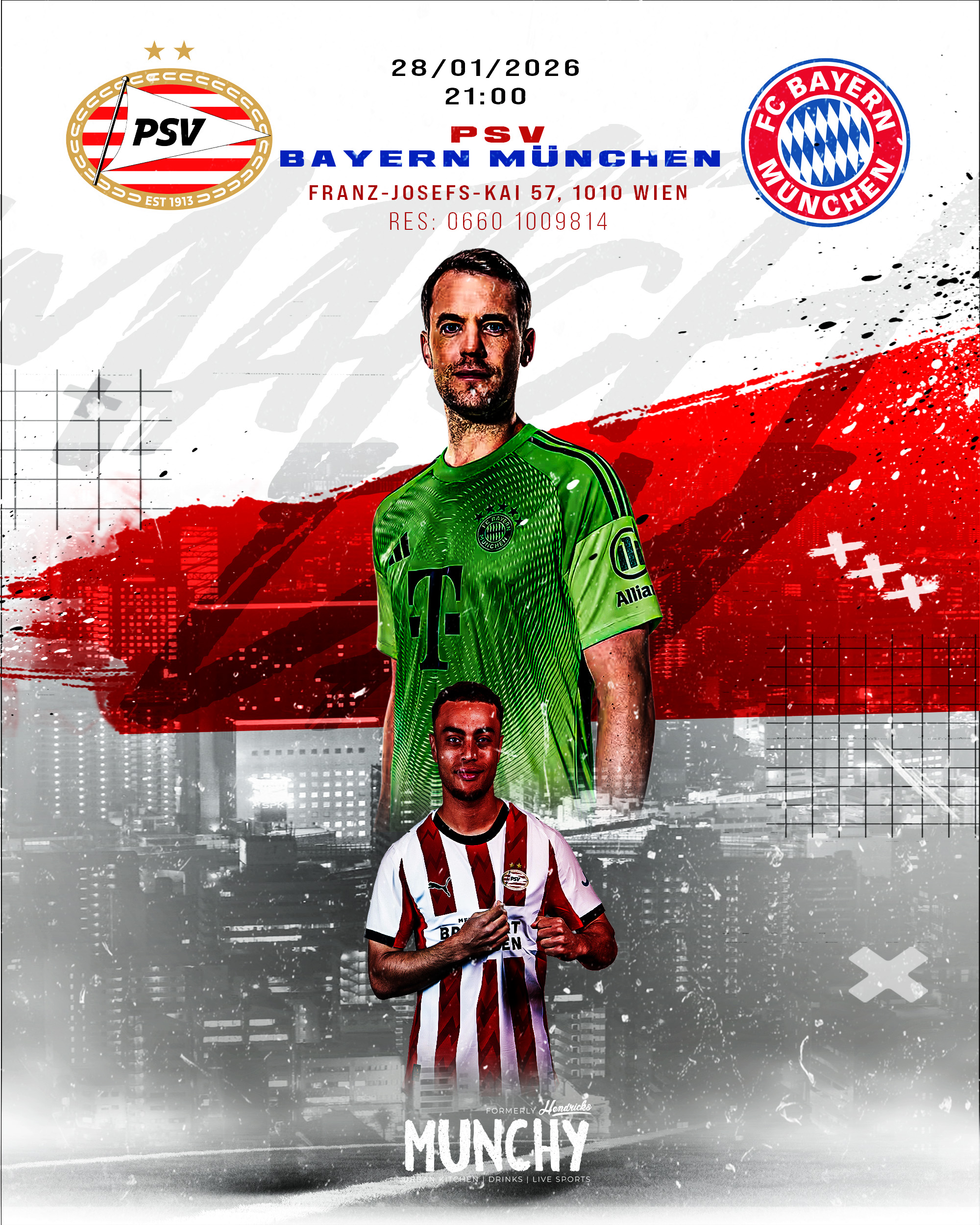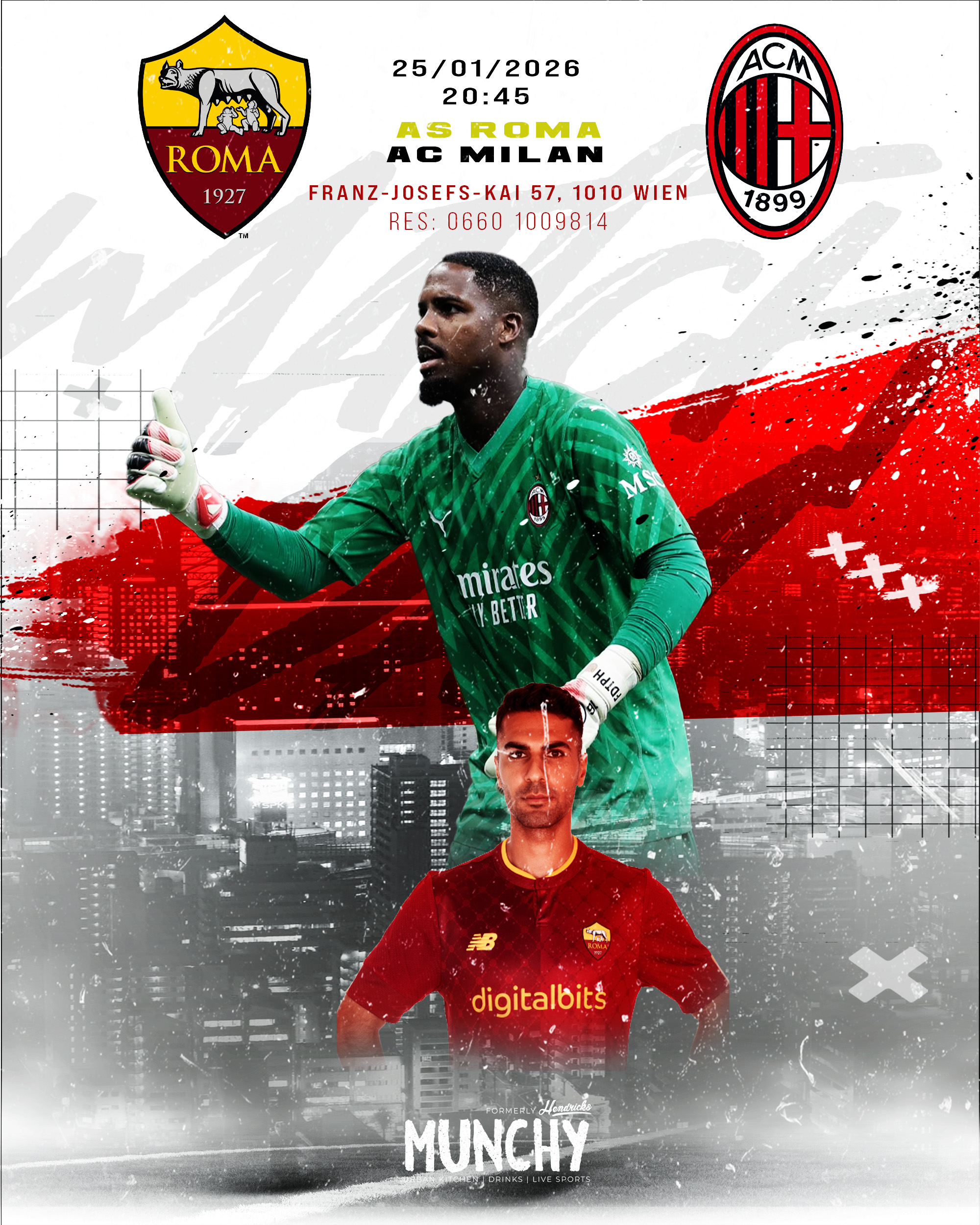 Munchy The Urban Kitchen Franz-Josefs-Kai 57, Wien, AustriaAm 25.01.2026 um 20:45 Uhr wird unser Spot zur heißesten Serie-A-Location Wiens, wenn AS Roma gegen AC Milan auf riesigen Screens, mit explosiver Stimmung, sattem Sound und eiskalten Drinks für pures italienisches Matchday-Feeling sorgt.